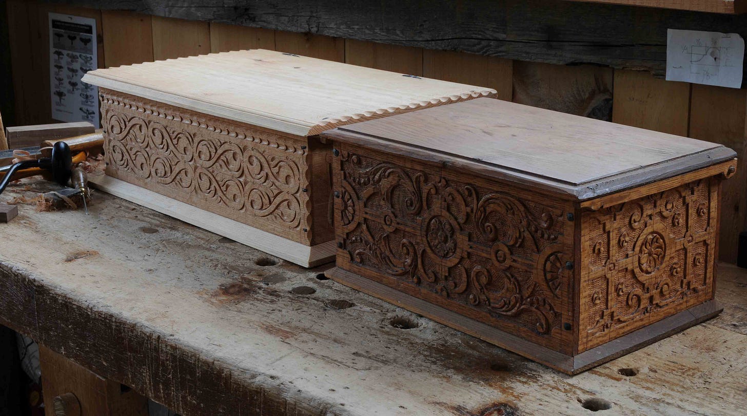Often people are surprised at the mixture of oak & pine, especially on the brand-new box. I remind them that use, light, polishing and handling will quickly darken the pine top & bottom. Here’s a photo I’ve used many times to show a new box on the left and a 15-year-old box on the right. We used it a lot, dusted & polished it a few times a year and let the light from the windows do the rest: