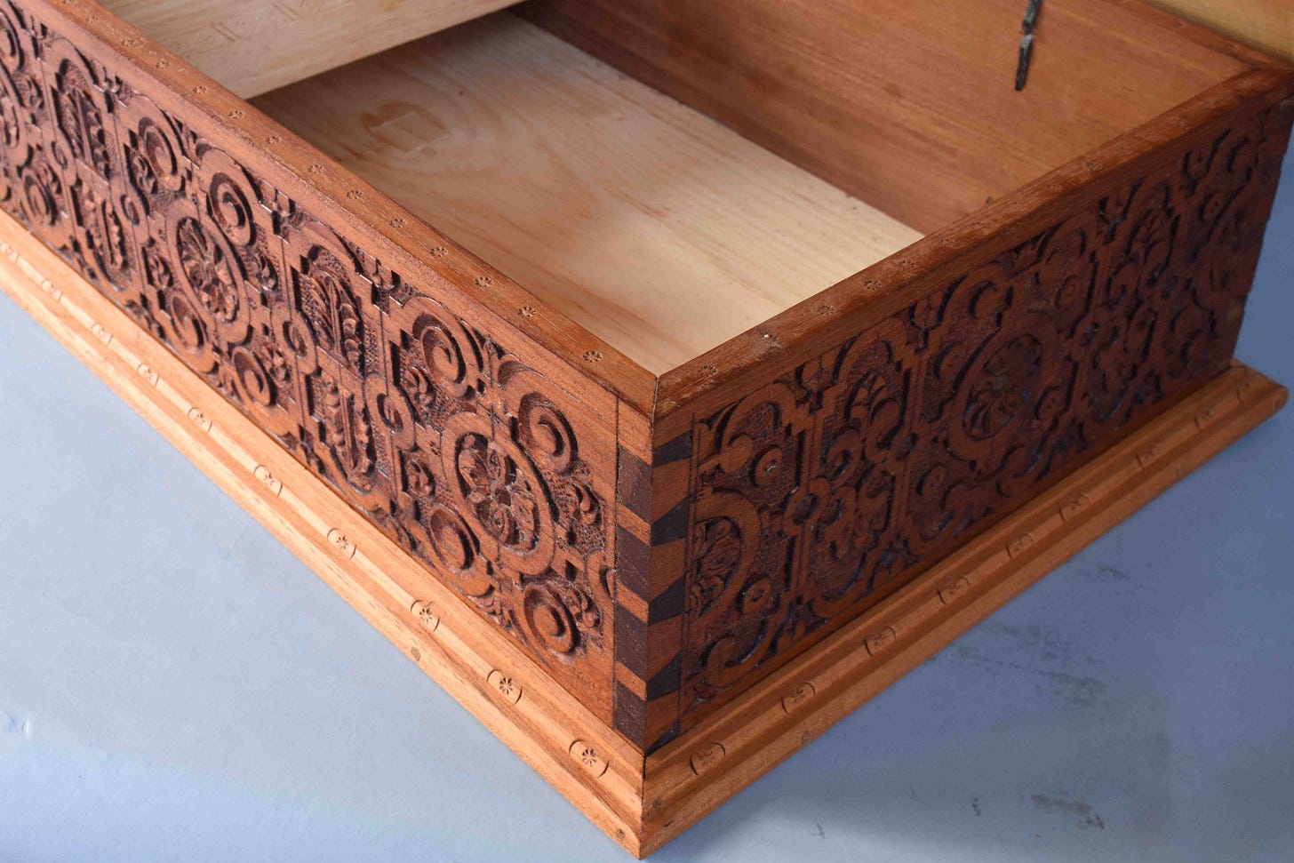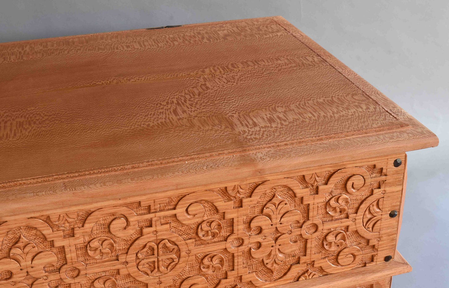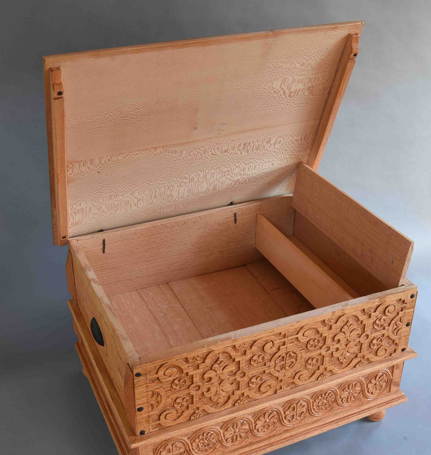 I made a base molding to wrap around the bottom edges of the box. The snipe/gimmal hinges are blacksmith-made, from Horton Brasses. Lidded till inside. Finished with linseed oil.