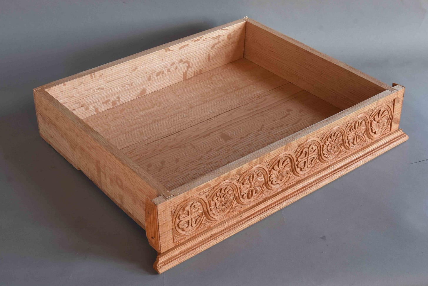 The drawer is all riven oak – the sides meet the drawer front with a sliding dovetail. Bottom boards are thin, edges meet with a small tongue & groove. No drawer pull, you open the drawer using those “glyphs” attached at the ends of the drawer front.